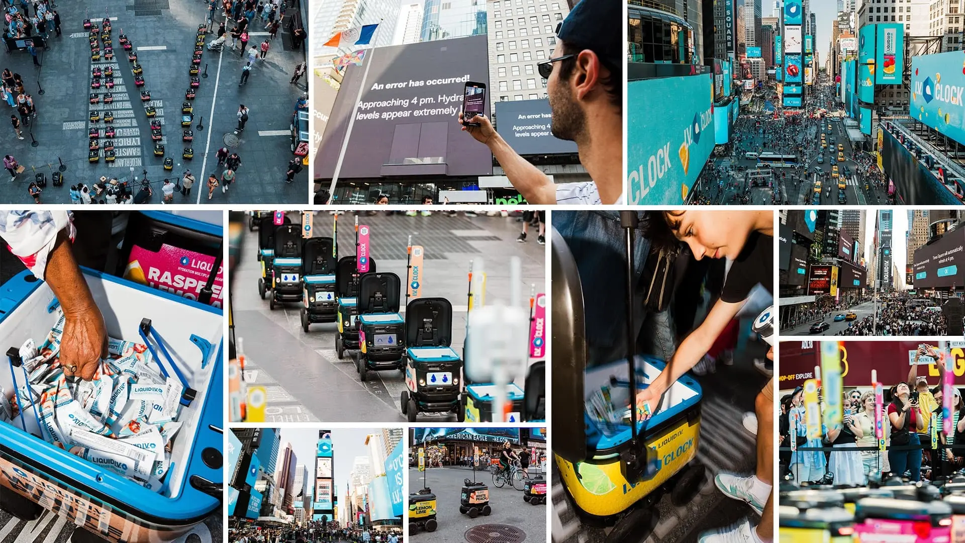 With a creative media strategy led by Scale by Zambezi, I.V. O’CLOCK kicked off at Times Square with an out-of-home takeover and activation. As 4PM approached, Times Square billboards went dark with an “error” message before revealing that the clock had struck IV and it was time to hydrate. With a team of 50 robots descending to deliver Liquid I.V., the choreographed sequence brought refreshed hydration right into the hands of passersby.